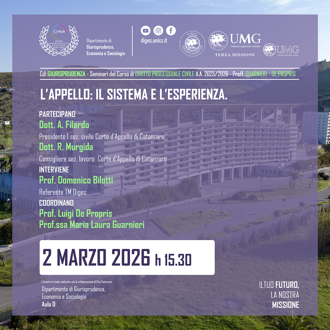 Il Dipartimento di Giurisprudenza, Economia e Sociologia (DiGES) promuove la ricerca scientifica nei settori giuridico, economico e sociologico, valorizzando l’interdisciplinarità e l’innovazione. Riconosciuto dal MUR come Dipartimento di Eccellenza 2023-2027, il DiGES partecipa a progetti di rilievo nazionale e internazionale, ospita la rivista scientifica Ordines e promuove numerose attività accademiche, culturali e di Terza Missione. Scopri di più sulla nostra offerta formativa e sulle iniziative visitando le sezioni del sito o contattandoci via e-mail.
