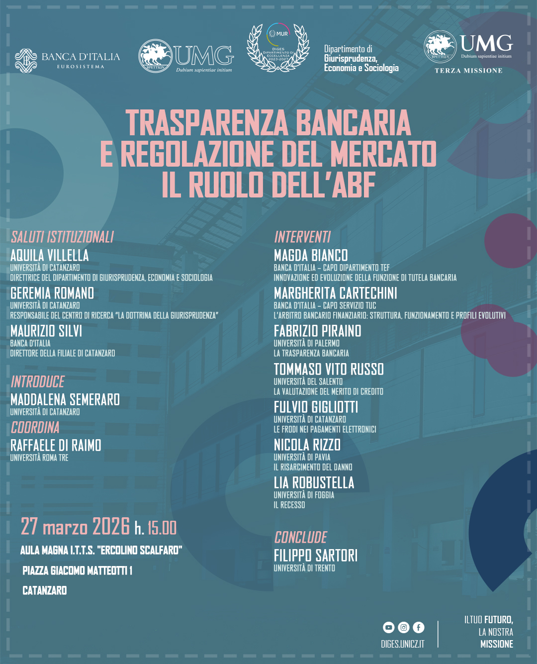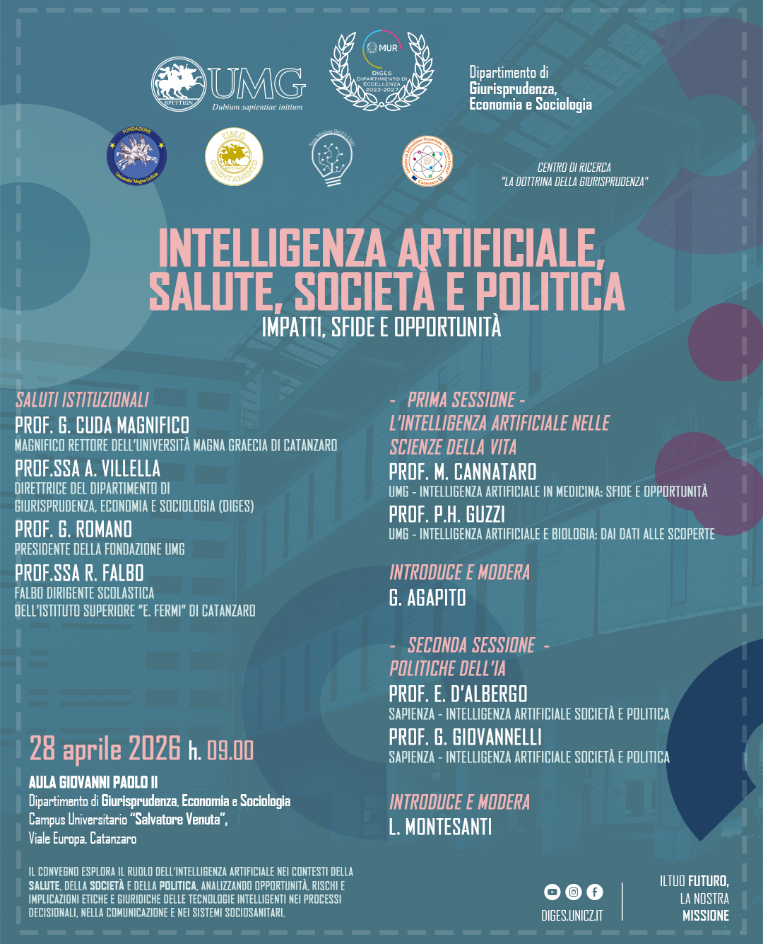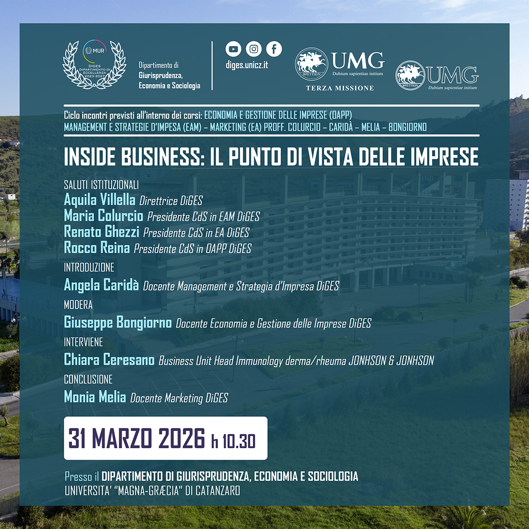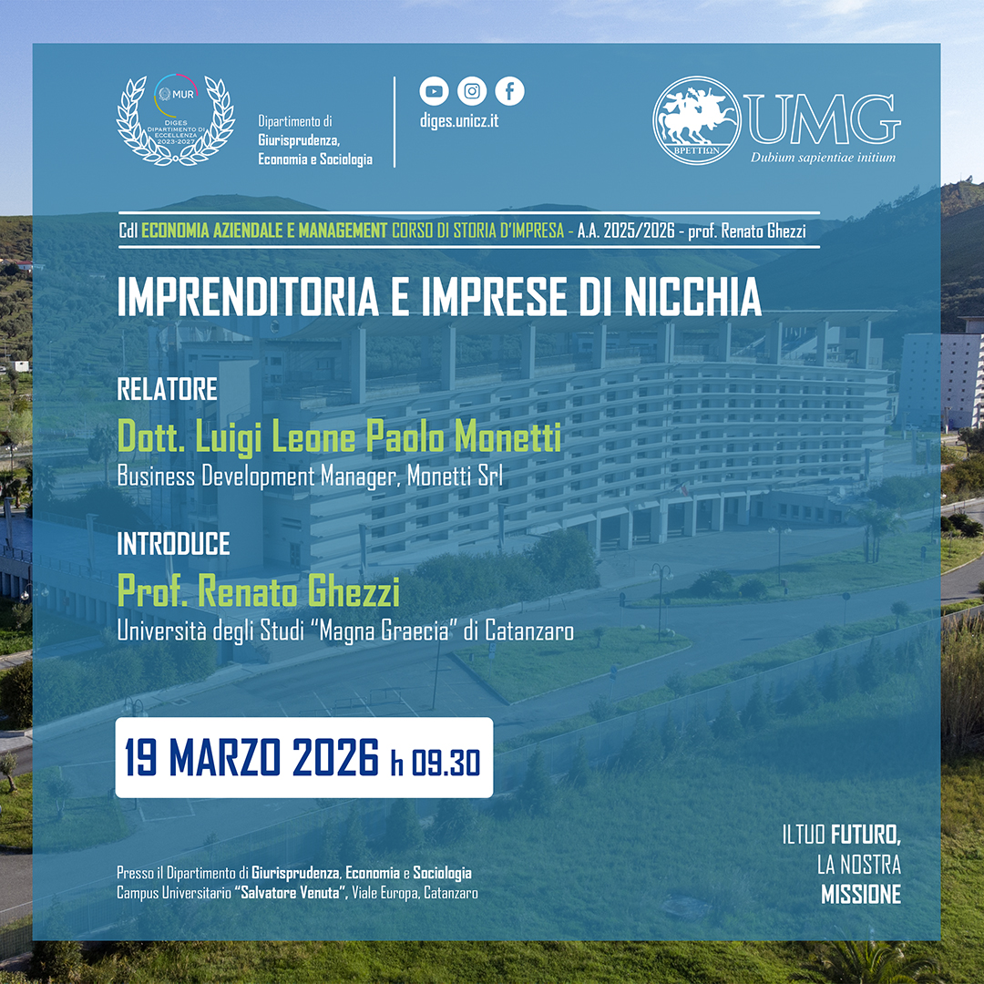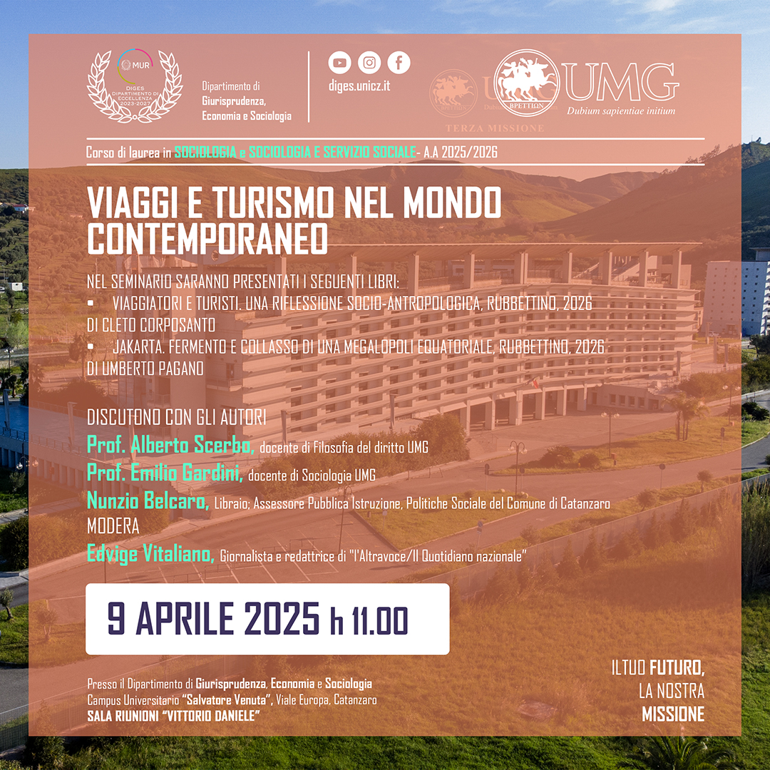 Il Dipartimento di Giurisprudenza, Economia e Sociologia (DiGES) promuove la ricerca scientifica nei settori giuridico, economico e sociologico, valorizzando l’interdisciplinarità e l’innovazione. Riconosciuto dal MUR come Dipartimento di Eccellenza 2023-2027, il DiGES partecipa a progetti di rilievo nazionale e internazionale, ospita la rivista scientifica Ordines e promuove numerose attività accademiche, culturali e di Terza Missione. Scopri di più sulla nostra offerta formativa e sulle iniziative visitando le sezioni del sito o contattandoci via e-mail.