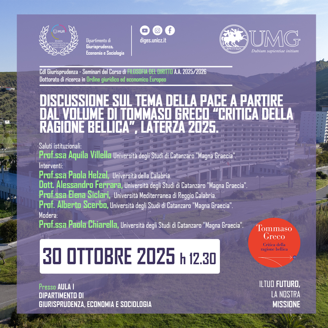 Seminario Discussione sul tema della pace a partire dal volume di Tommaso Greco Critica della ragione bellica, Laterza 2025.