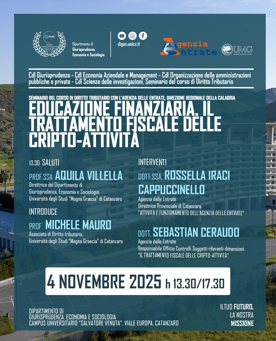 Seminario "Educazione finanziaria. Il trattamento fiscale delle cripto-attività" cattedra di Diritto tributario"