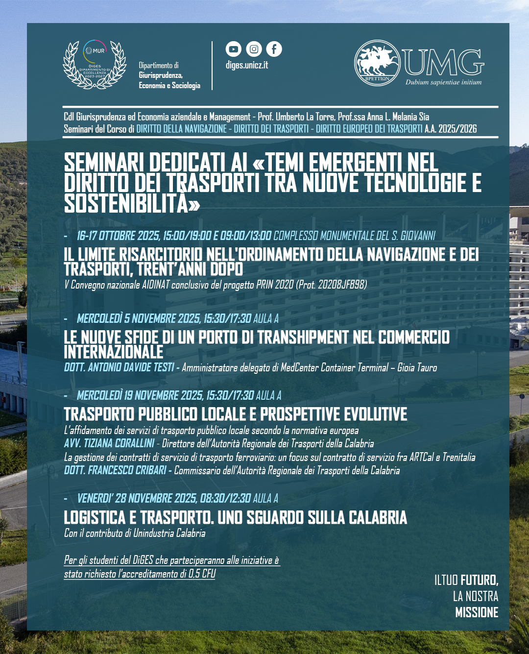 Seminari dedicati ai «Temi emergenti nel Diritto dei trasporti tra nuove tecnologie e sostenibilità» Prof.ssa Sia e Prof. La Torre