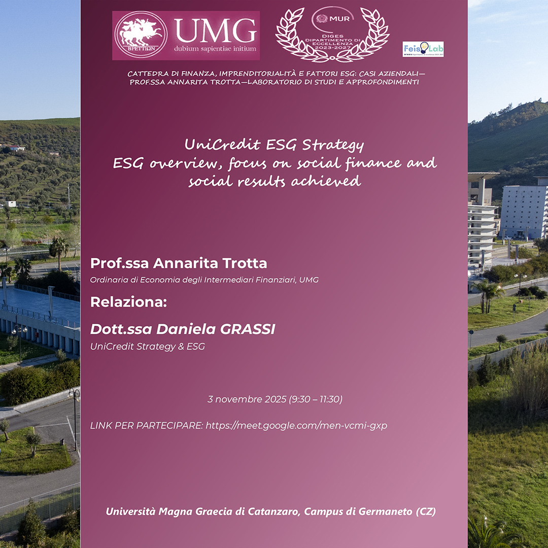 Il 3 novembre 2025 si svolgerà, inoltre, un Laboratorio dedicato al caso “UniCredit ESG Strategy”, in occasione del quale la dott.ssa Daniela Grassi, UniCredit Strategy & ESG, in collegamento da Milano, illustrerà le più recenti strategie UniCredit in tema di finanza ESG e ad impatto.
