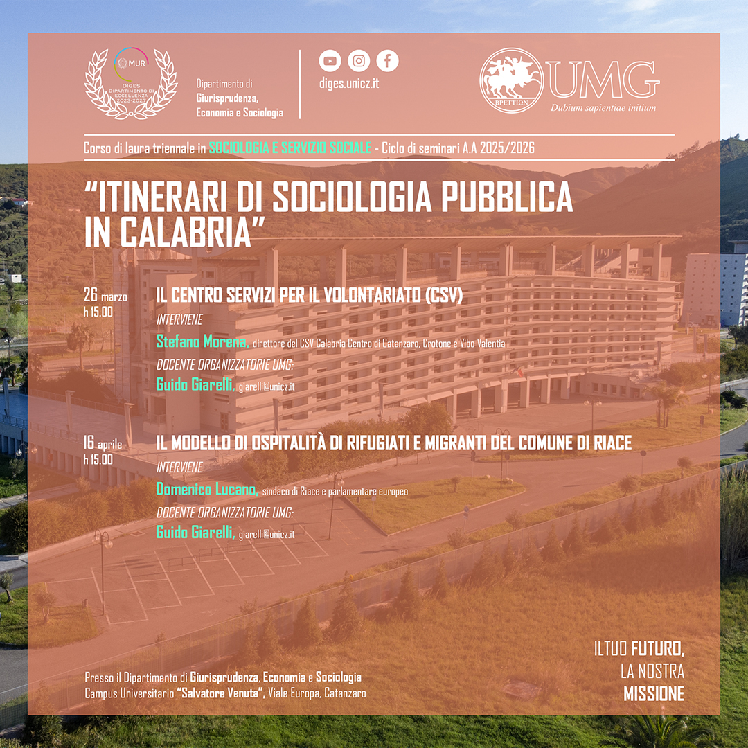 Prende avvio il ciclo di seminari "Itinerari di sociologia pubblica in Calabria", un ciclo di incontri di taglio pratico relativo a diverse problematiche sociali con particolare riferimento al contesto territoriale calabrese. Gli incontri si inseriscono in una strategia formativa fondamentale per sviluppare la sensibilità sociale e la capacità applicativa della strumentazione teorica e metodologica. Sarà una preziosa occasione formativa e di orientamento per gli studenti dei Corsi di laurea in Sociologia e Servizio Sociale ma aperta, ovviamente, a chiunque vi abbia interesse!